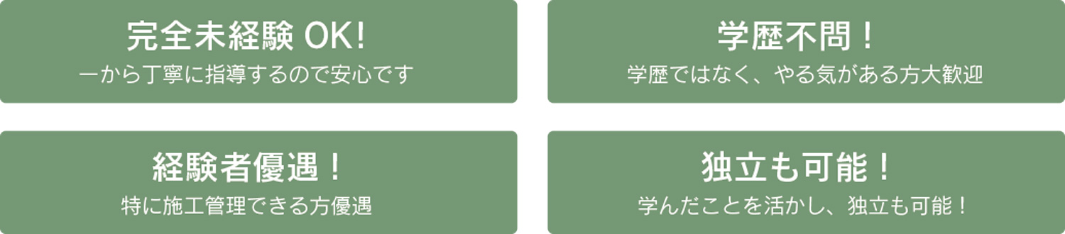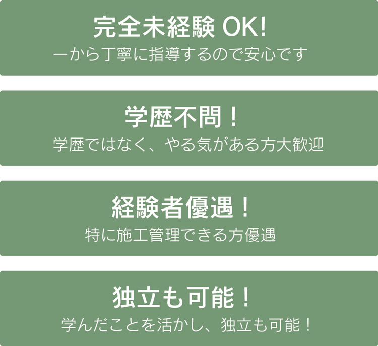 | 休日・休暇 | 日曜・祝日・雨天時(現場による)、土曜日休みは会社規定による ※お盆休み(5〜7日)/GW休み(4〜5日)/正月休み(5〜7日) |